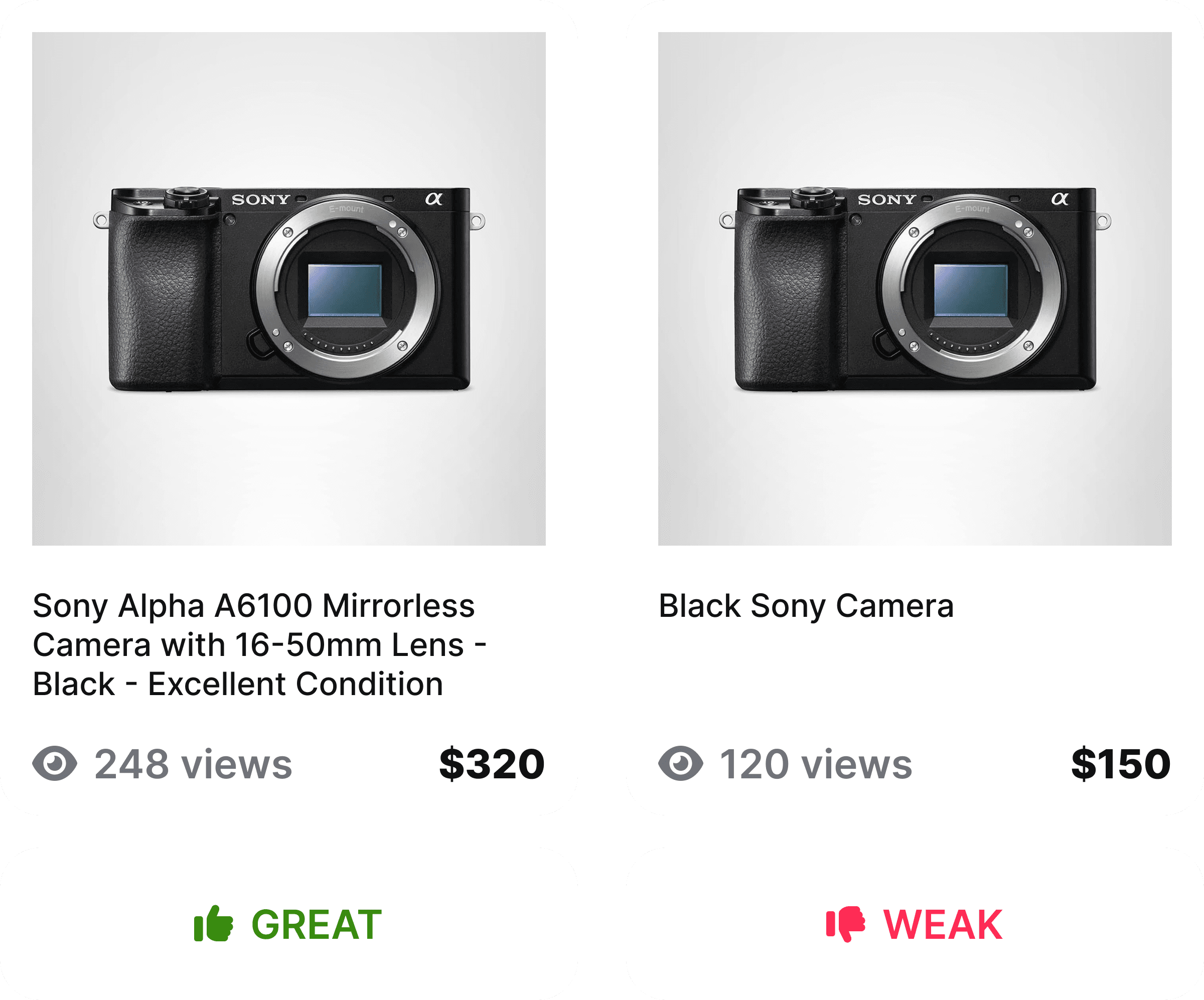 Avoid: Vague titles like “Great camera” or “Nice jacket.” Studies suggest that replacing vague terms with specific keywords increases search ranking and conversion.